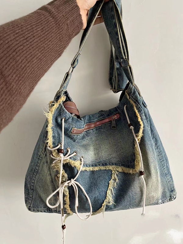Y2K Denim Raw Detail Zip Up Tie Front Crossbody Bag