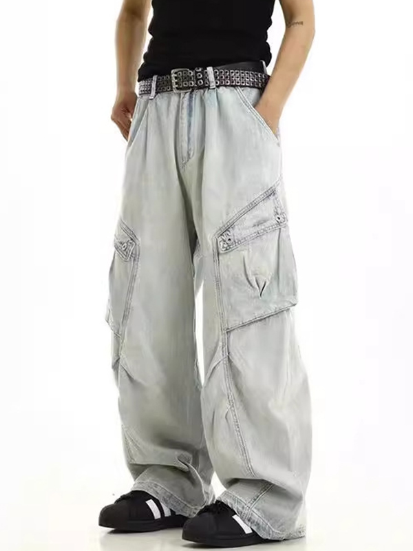 Hip Pop Multi Pocket Raw Trim Tie Up Cargo Jeans