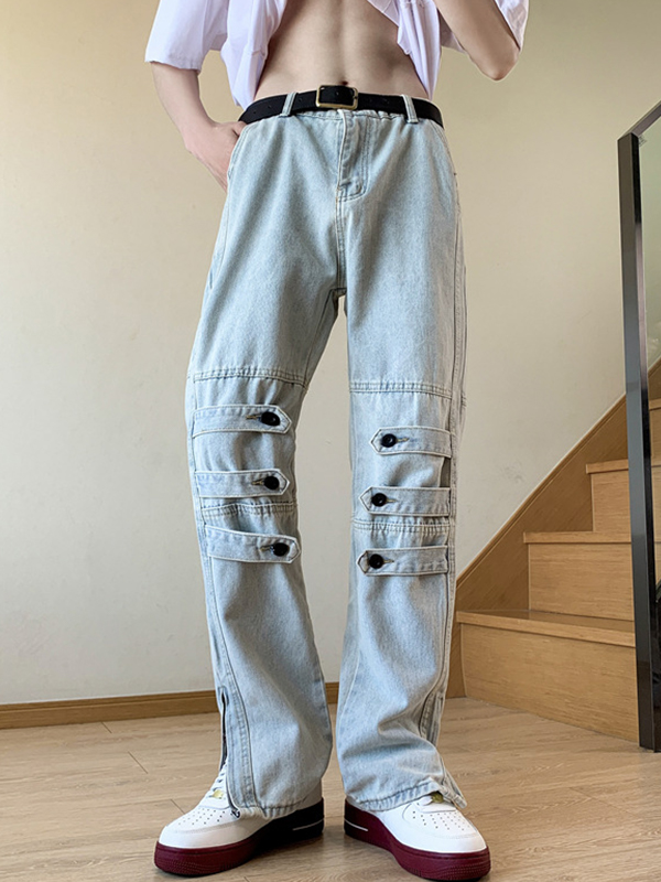 Hip Pop Multi Pocket Raw Trim Tie Up Cargo Jeans