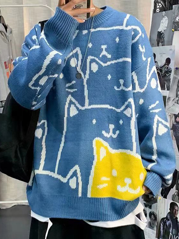 Men’s All Over Cartoon Cat Jacquard Crew Neck Sweater