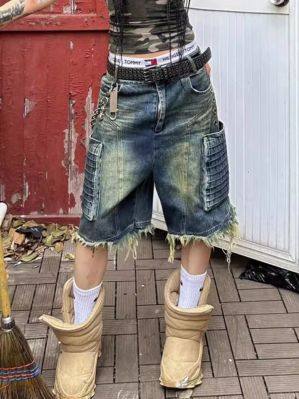 Washed Denim Raw Edge Pockets Denim Shorts