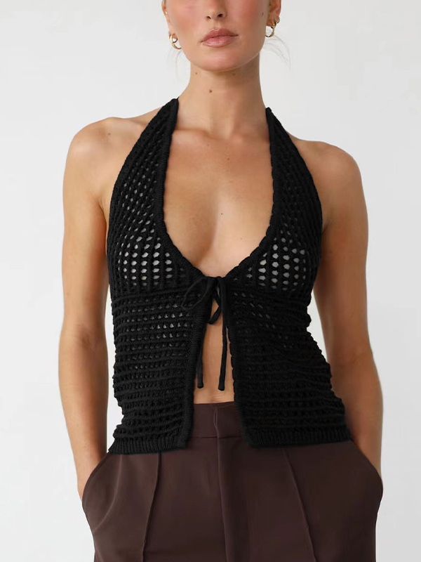 Stylish knitted hollow cardigan halter vest. Slim fit, lightweight, and comfy. Perfect for casual or vintage looks!